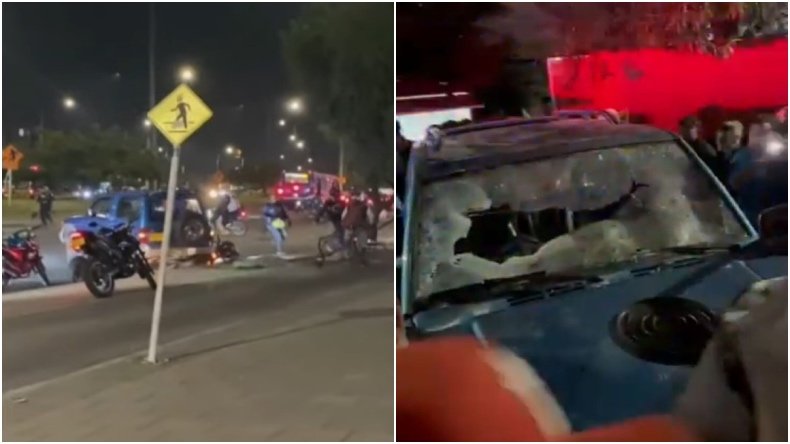 Según las grabaciones, alrededor de las 10:21 p.m., la camioneta azul ingresó al conjunto residencial como parte de la huida, realizó maniobras peligrosas, colisionó con motocicletas y otros objetos, lo que generó que un grupo de moteros reaccionara rápidamente.